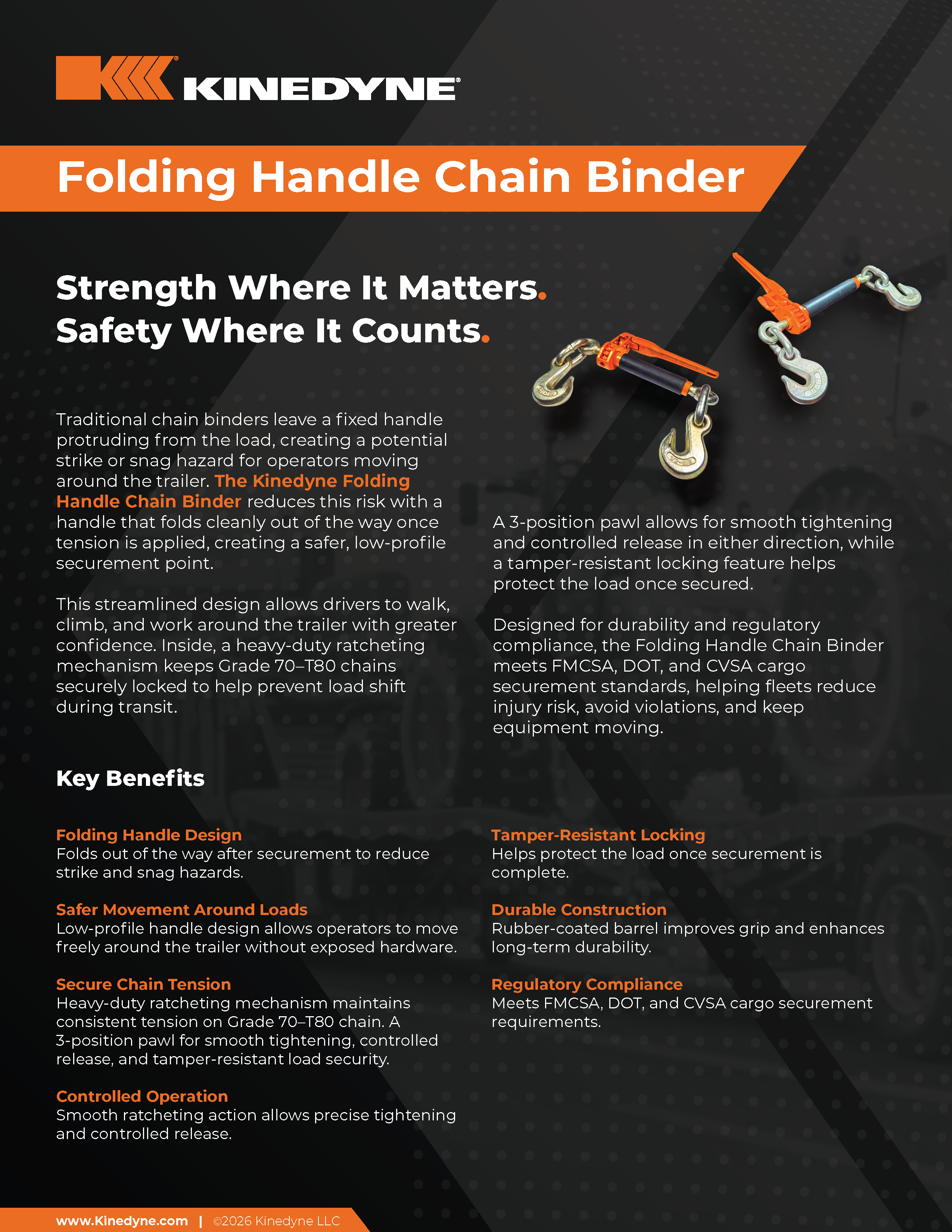 Kinedyne's Folding Handle Chain Binder handle stows neatly out of the way helping reduce strike hazards, improving mobility around the trailer.